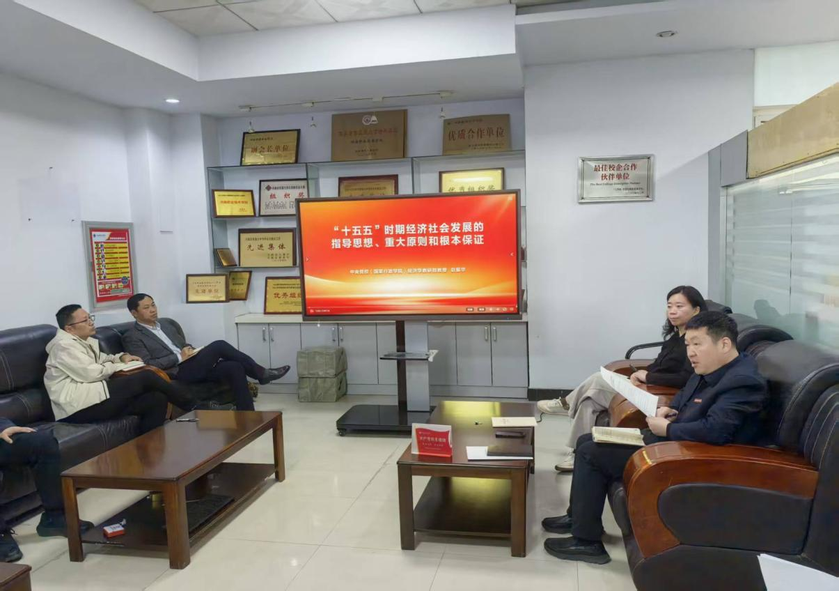 本次学习采用个人自学 + 集中收看专题课程相结合的形式,组织党员干部原文学习《中共中央关于制定国民经济和社会发展第十五个五年规划的建议》,集中观看《“十五五”时期经济社会发展的指导思想、重大原则和根本保证》《“十五五”时期经济社会发展的重大战略任务》专题视频,并结合招生就业工作实际开展深入研讨。