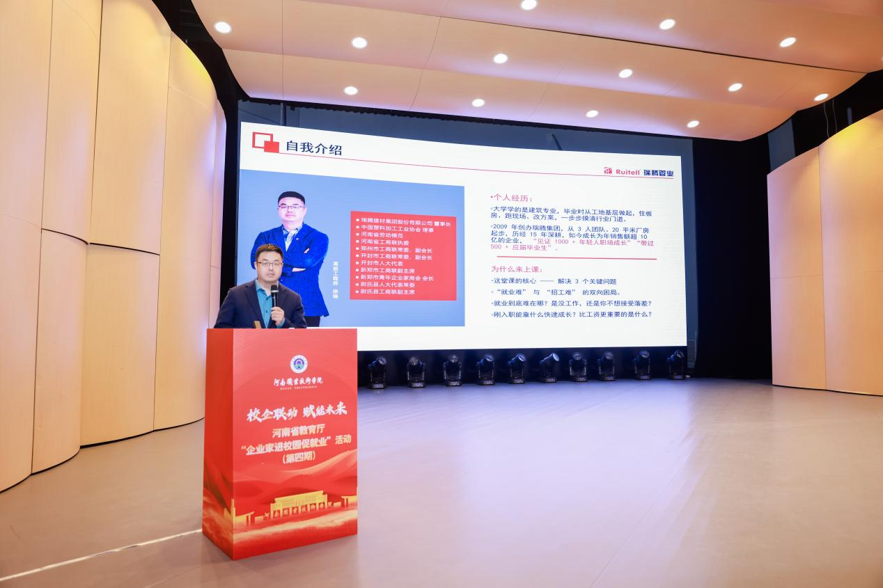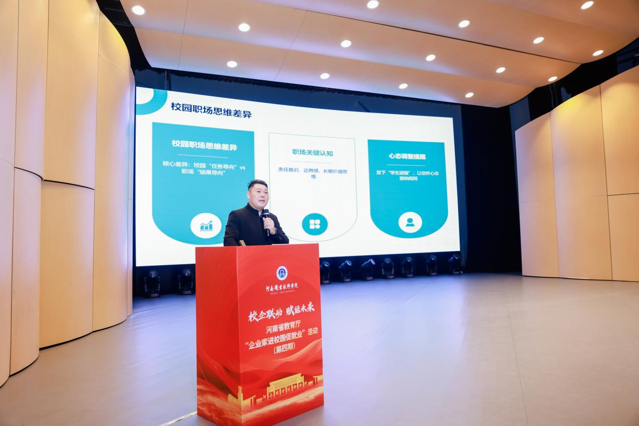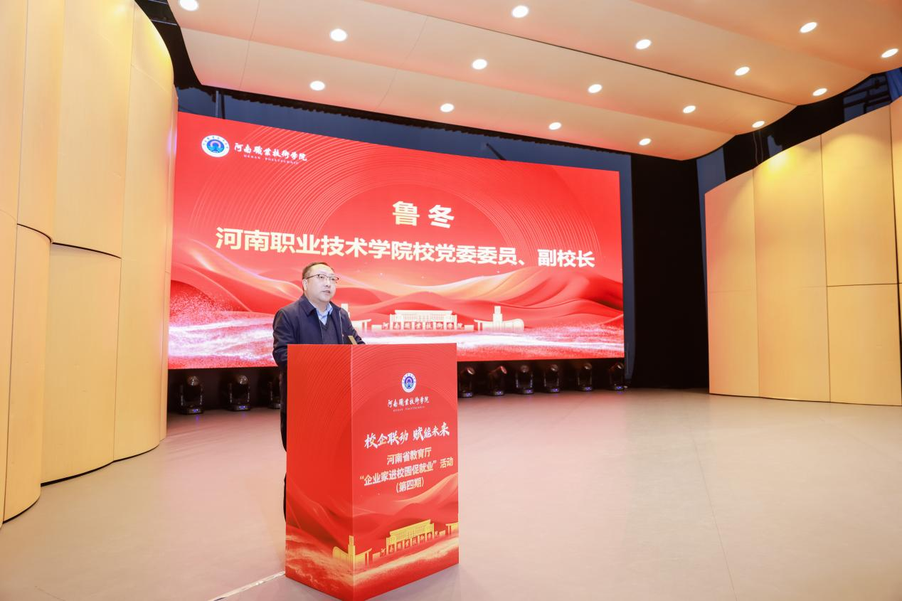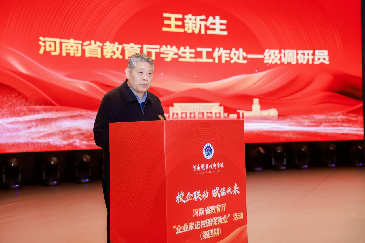 2025年12月11日上午,河南省教育厅“企业家进校园促就业”第四期活动在河南职业技术学院隆重举行。华北水利水电大学、郑州航空工业管理学院、郑州工程技术学院、河南开放大学及我校500余名师生齐聚现场,共赴这场职场赋能盛宴。河南省教育厅学生工作处一级调研员王新生,河南省大中专毕业生就业创业促进会会长岳修峰,我校党委委员、副校长鲁冬出席活动。