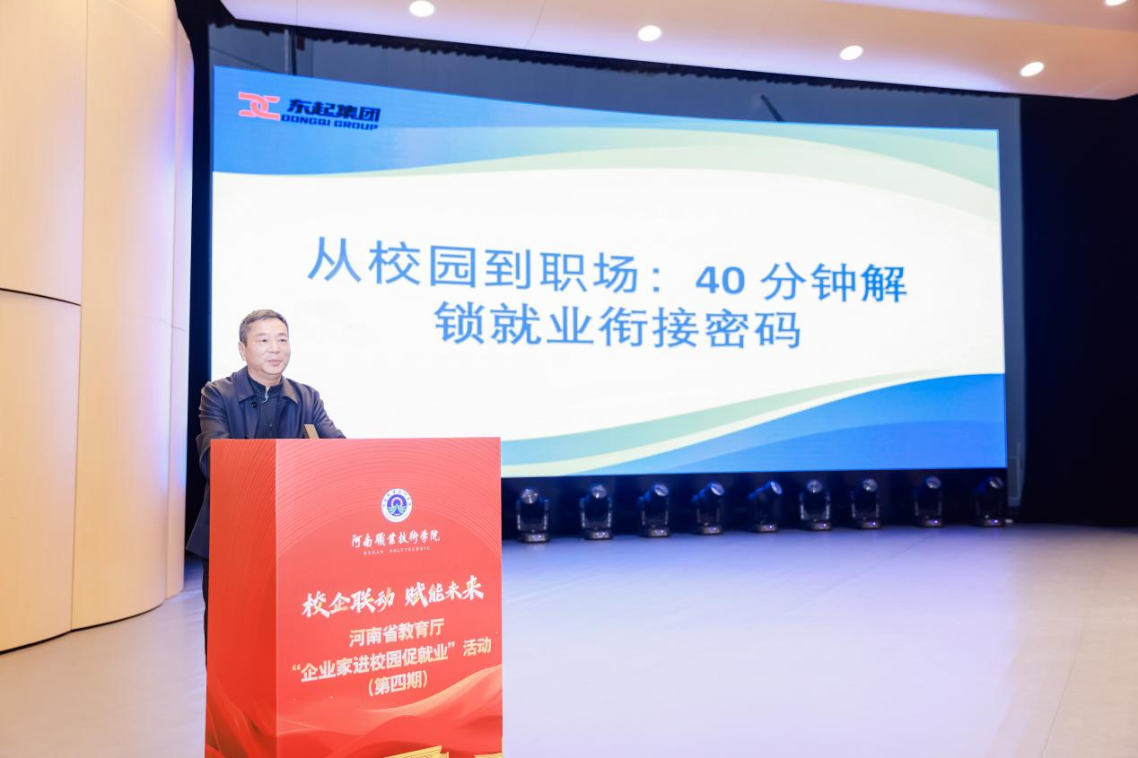 鲁冬在致辞中对省教育厅、省就业创业促进会及社会各界长期以来对河南职院建设发展的关心与支持表示感谢。他介绍了学校的办学特色、专业布局、建设成果及发展规划,分享了学校通过构建立体化就业工作网络和“大就业”工作格局助力大学生就业取得的实践成效。他鼓励同学们珍惜此次“行走的职业生涯教育大课堂”的学习机会,认真汲取经验、洞察行业前沿、明确职业航向,以榜样为力量,在未来职场中稳步成长、实现人生价值。